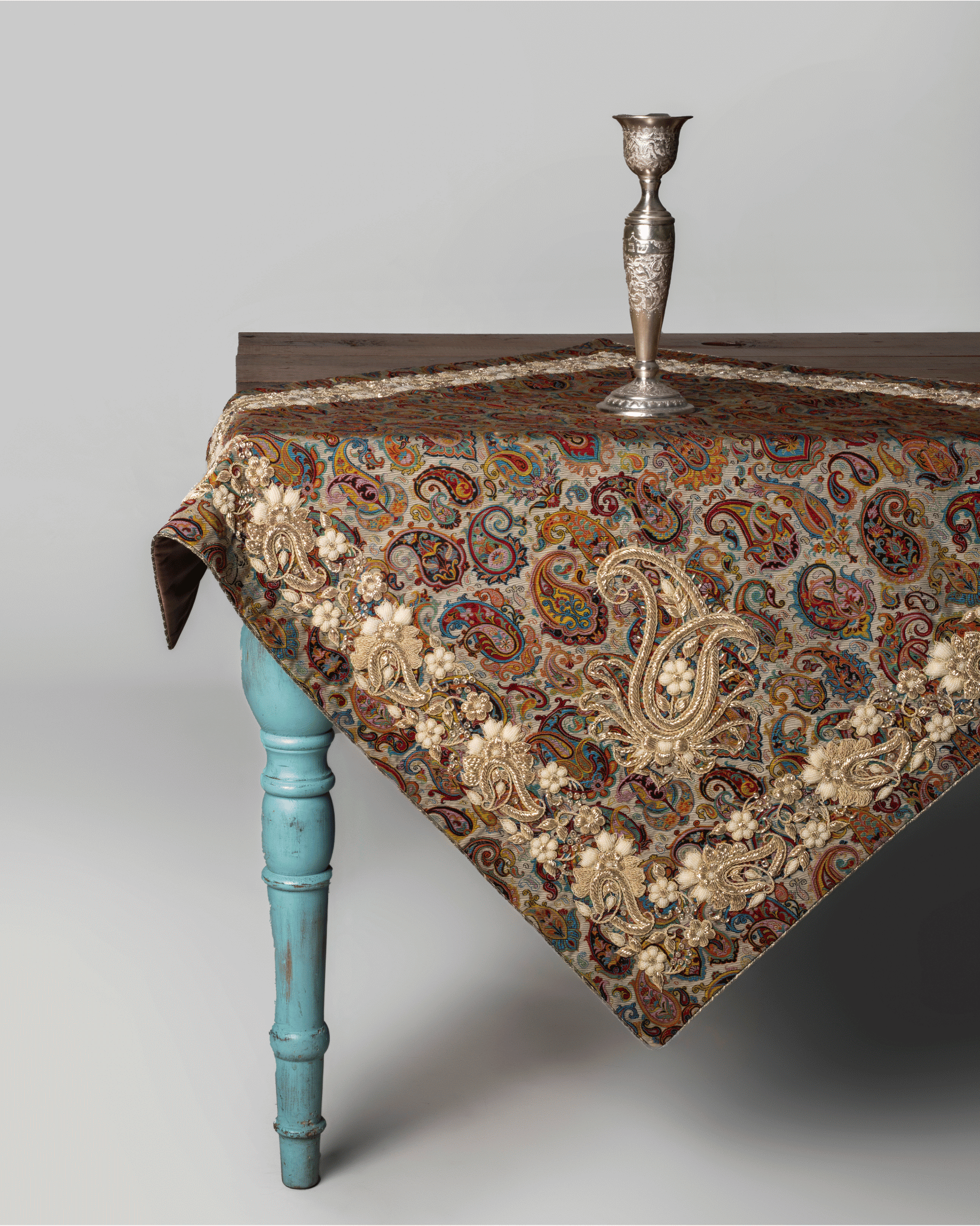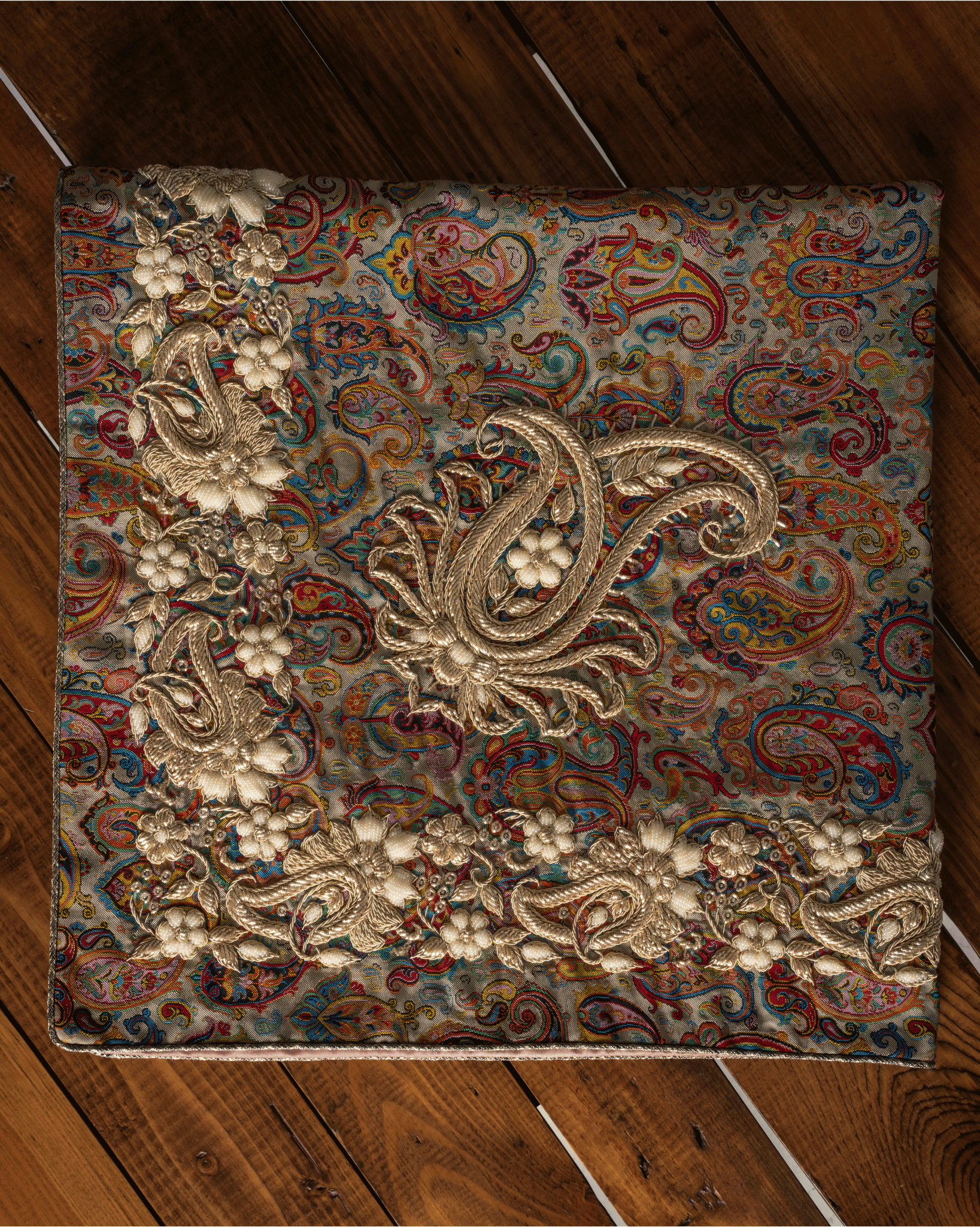 The fabric featured in this artwork is Termeh, a luxurious silk textile renowned for its elegance and vibrancy, crafted in the historic city of Yazd. Each piece is transformed into a masterpiece by skilled artisans, who breathe life into its intricate patterns with hand-embroidered metallic threads (sermeh) and shimmering beads. These designs, initially envisioned by designers through traditional printing, are elevated through hours of delicate craftsmanship. The result is a timeless expression of authentic Iranian art, offered as a heartfelt gift to grace and enrich your home.