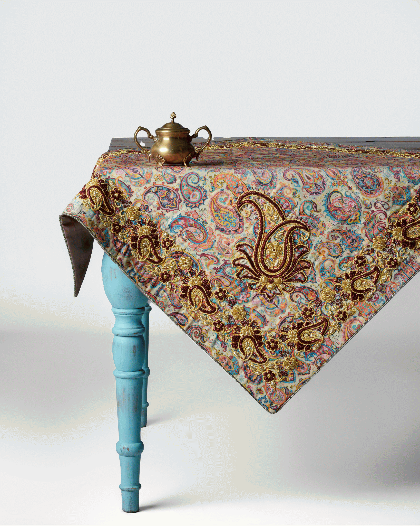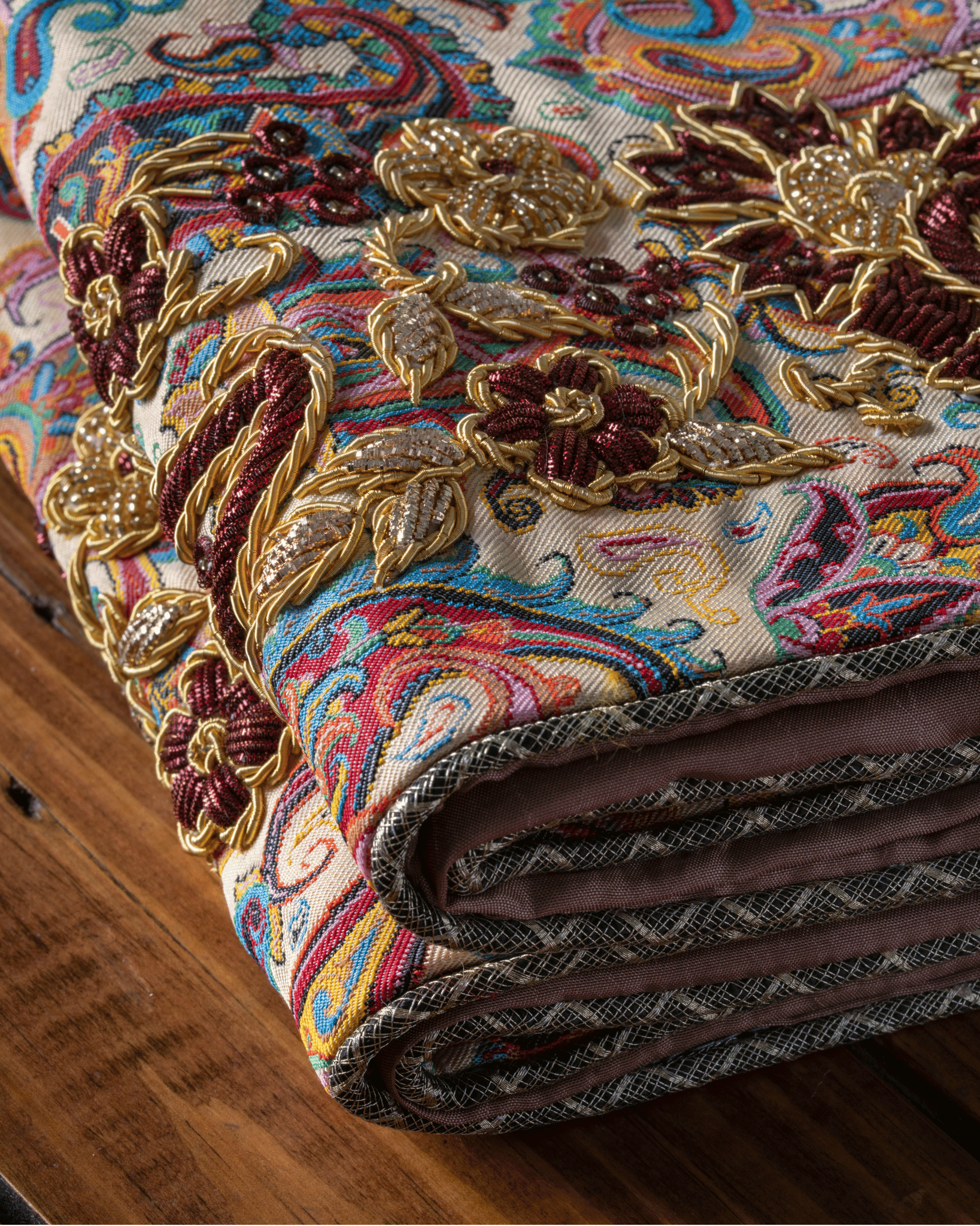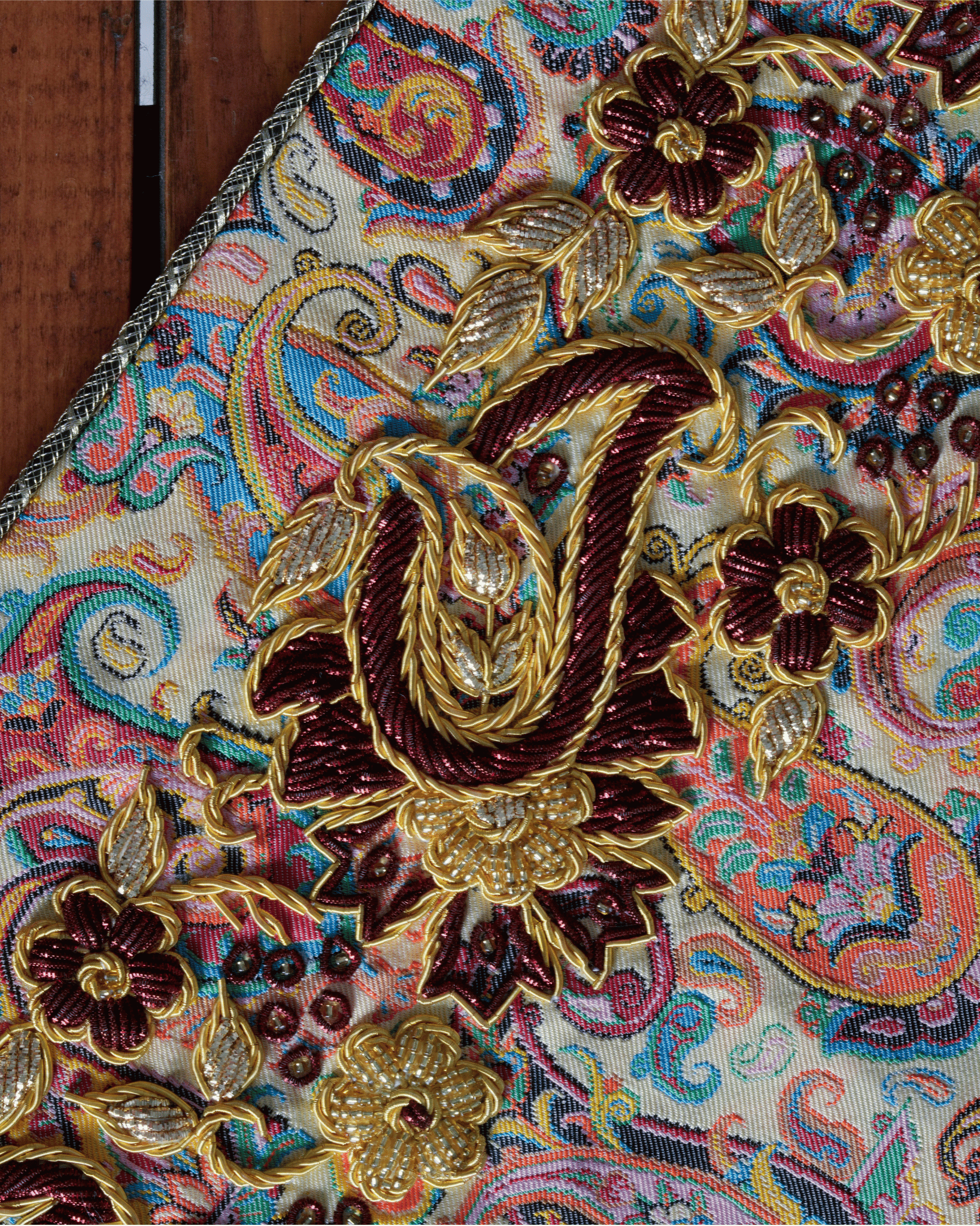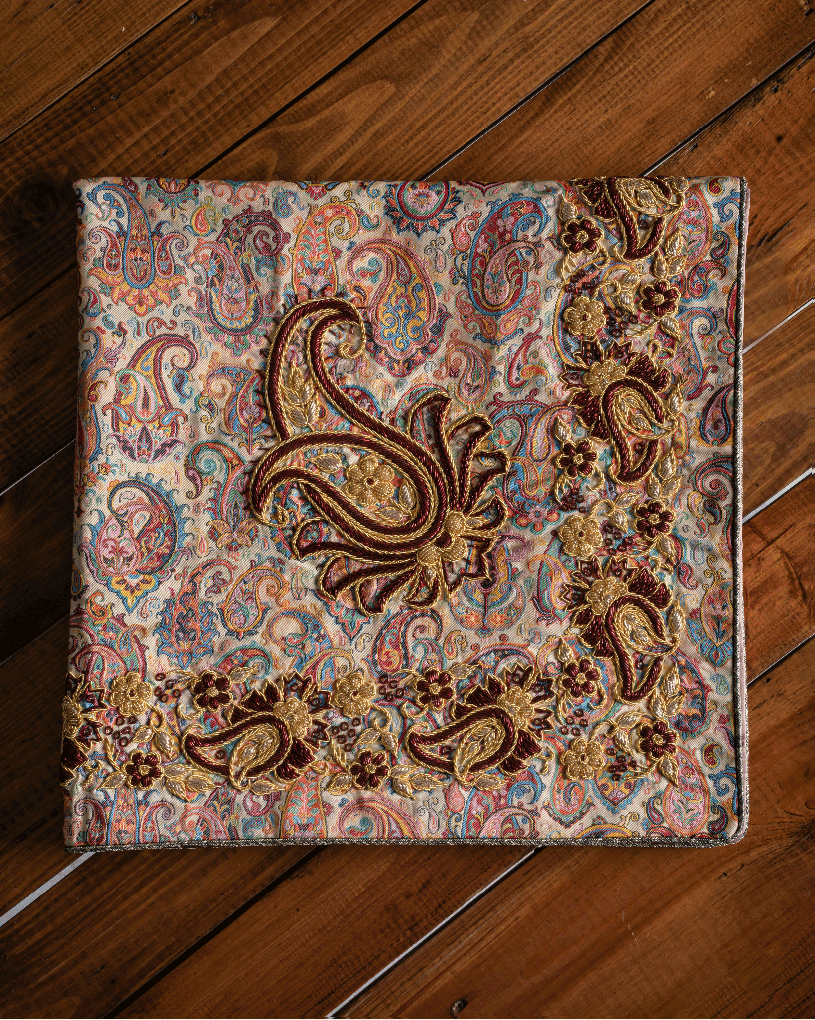 The fabric featured in this artwork is Termeh, a luxurious silk textile renowned for its elegance and vibrancy, crafted in the historic city of Yazd. Each piece is transformed into a masterpiece by skilled artisans, who breathe life into its intricate patterns with hand-embroidered metallic threads (sermeh) and shimmering beads. These designs, initially envisioned by designers through traditional printing, are elevated through hours of delicate craftsmanship. The result is a timeless expression of authentic Iranian art, offered as a heartfelt gift to grace and enrich your home.