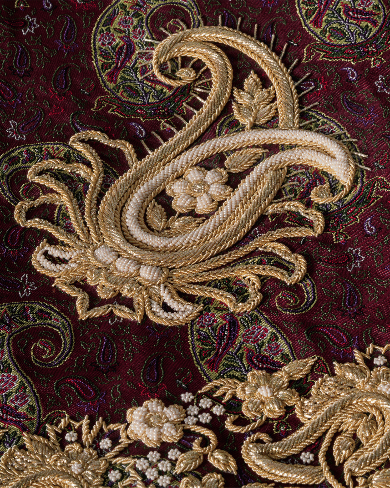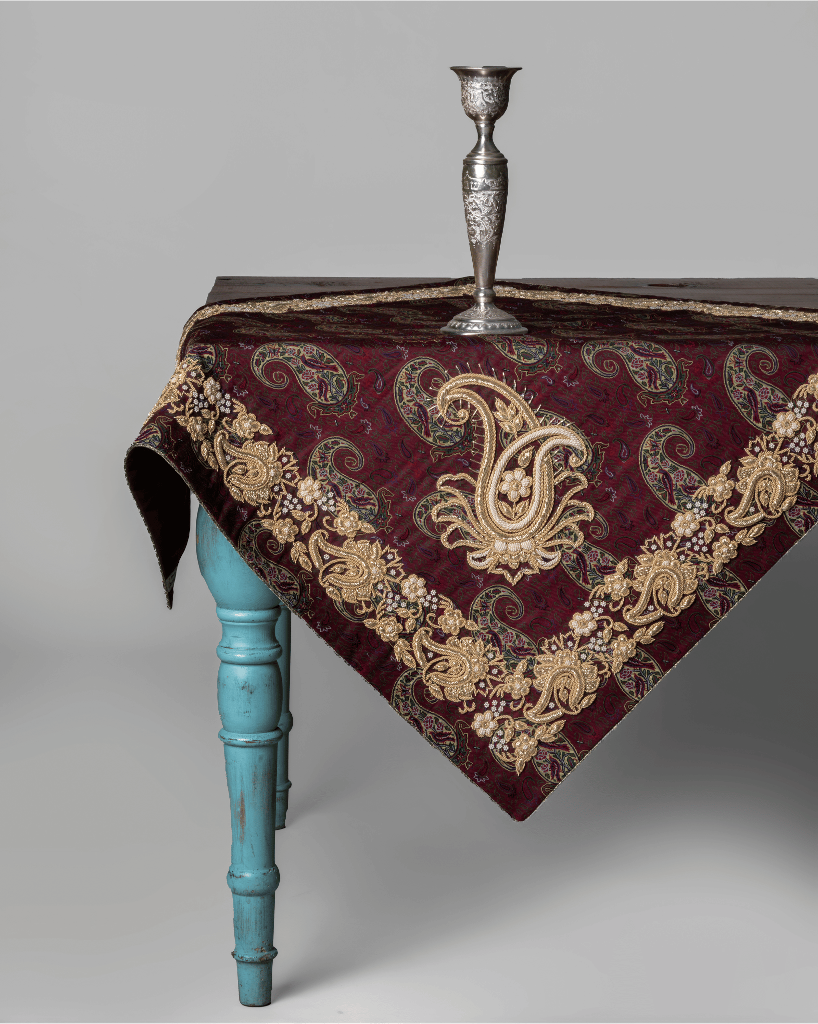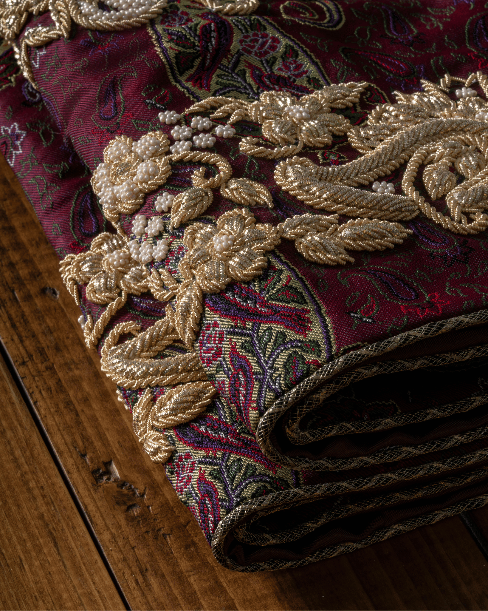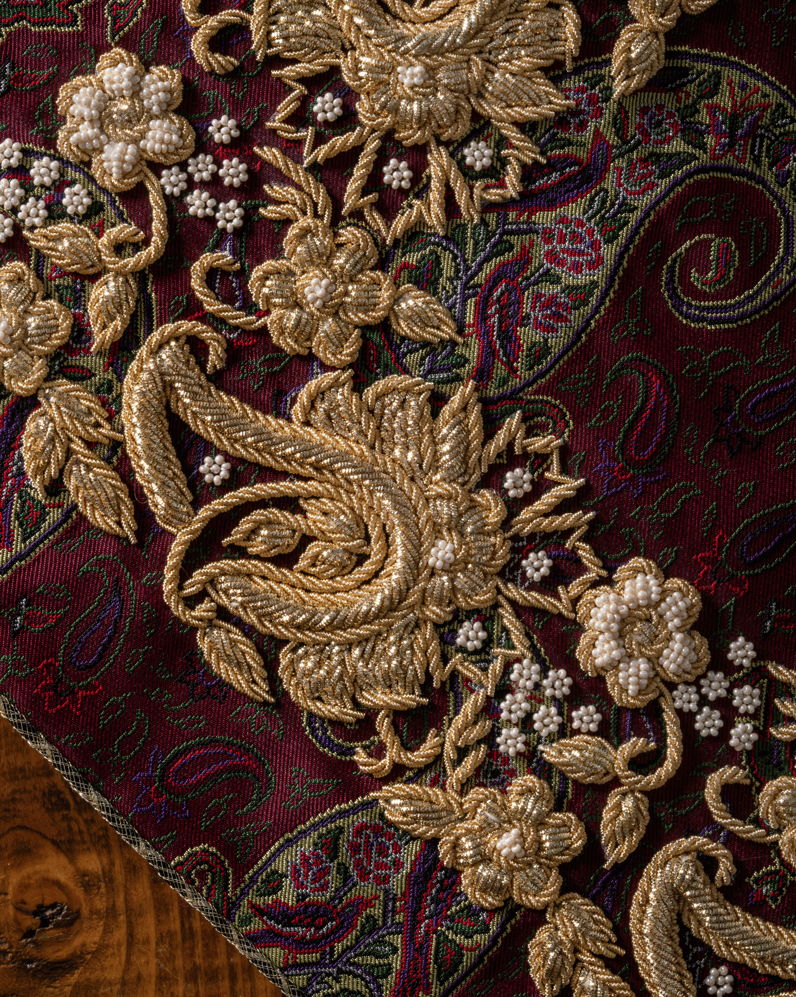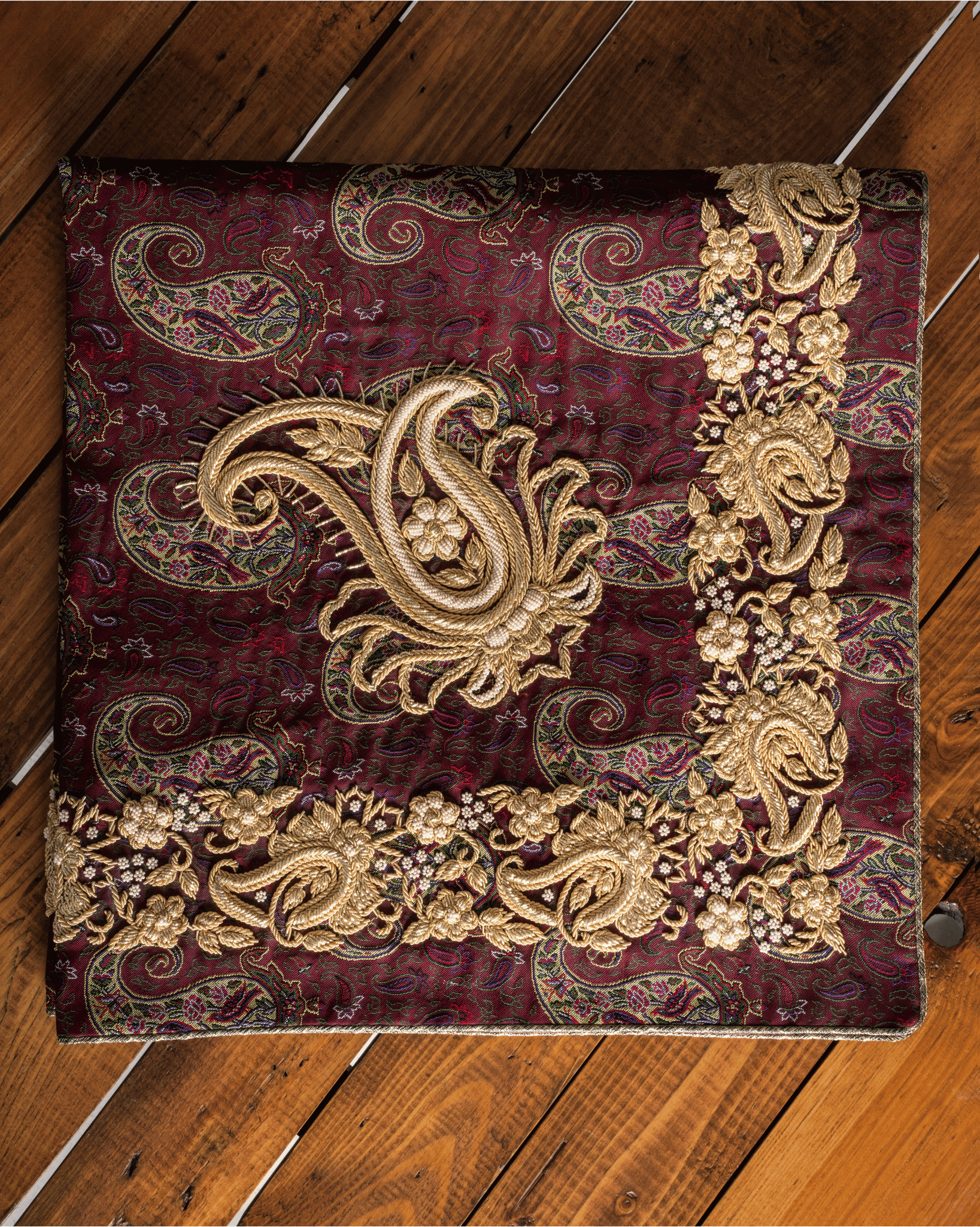 The fabric featured in this artwork is Termeh, a luxurious silk textile renowned for its elegance and vibrancy, crafted in the historic city of Yazd. Each piece is transformed into a masterpiece by skilled artisans, who breathe life into its intricate patterns with hand-embroidered metallic threads (sermeh) and shimmering beads. These designs, initially envisioned by designers through traditional printing, are elevated through hours of delicate craftsmanship. The result is a timeless expression of authentic Iranian art, offered as a heartfelt gift to grace and enrich your home.