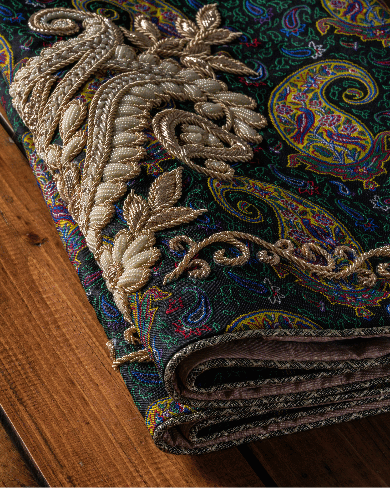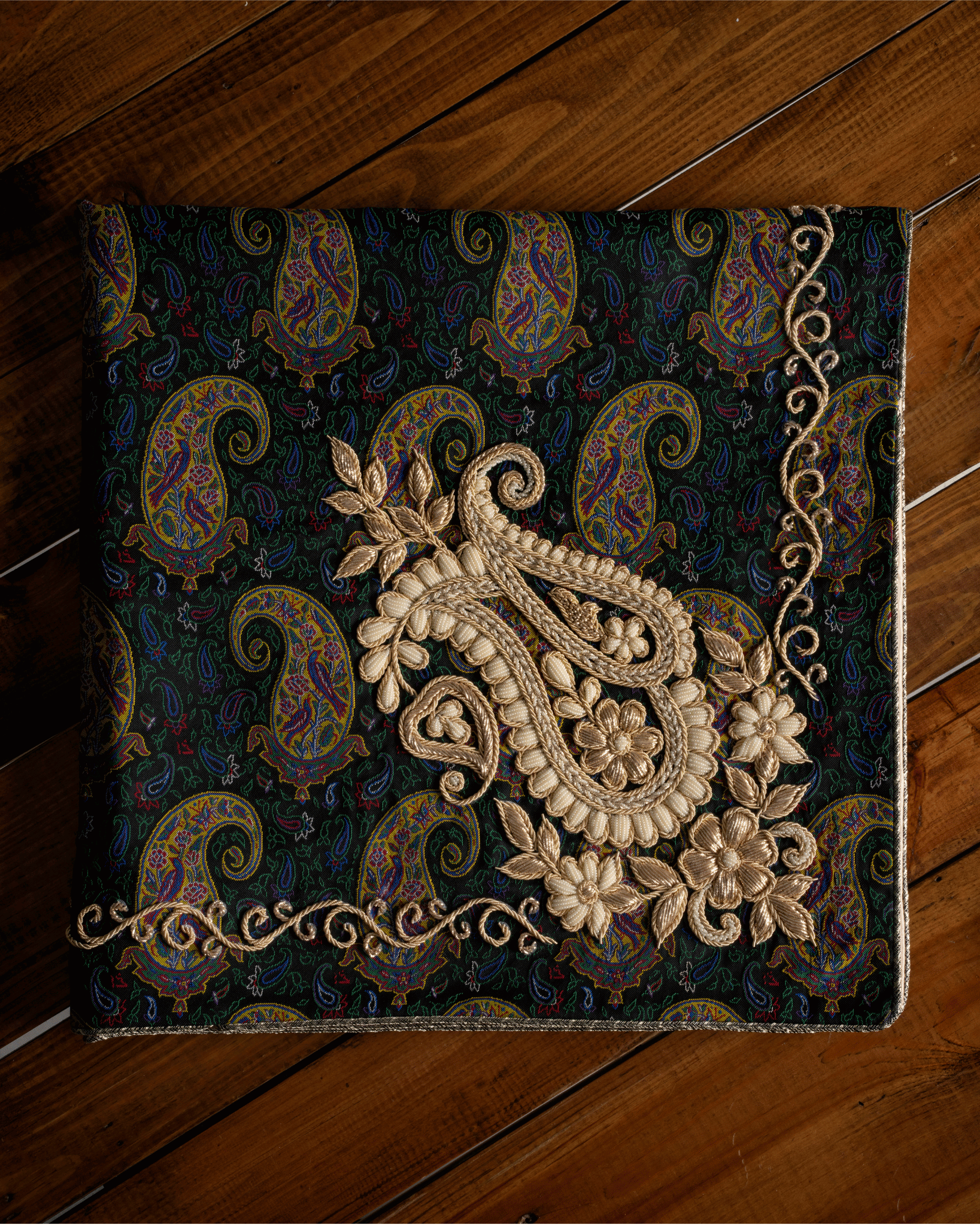 The fabric featured in this artwork is Termeh, a luxurious silk textile renowned for its elegance and vibrancy, crafted in the historic city of Yazd. Each piece is transformed into a masterpiece by skilled artisans, who breathe life into its intricate patterns with hand-embroidered metallic threads (sermeh) and shimmering beads. These designs, initially envisioned by designers through traditional printing, are elevated through hours of delicate craftsmanship. The result is a timeless expression of authentic Iranian art, offered as a heartfelt gift to grace and enrich your home.