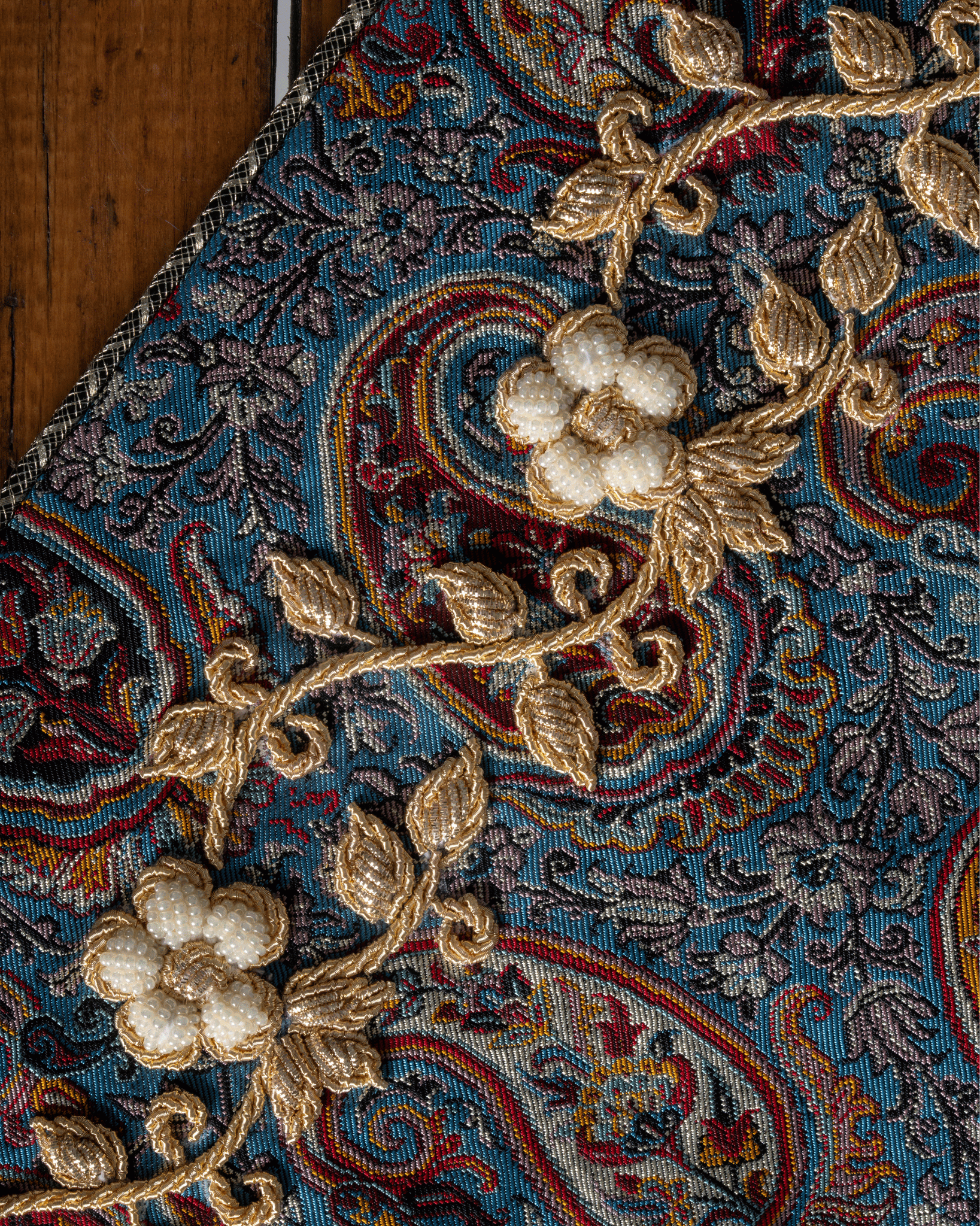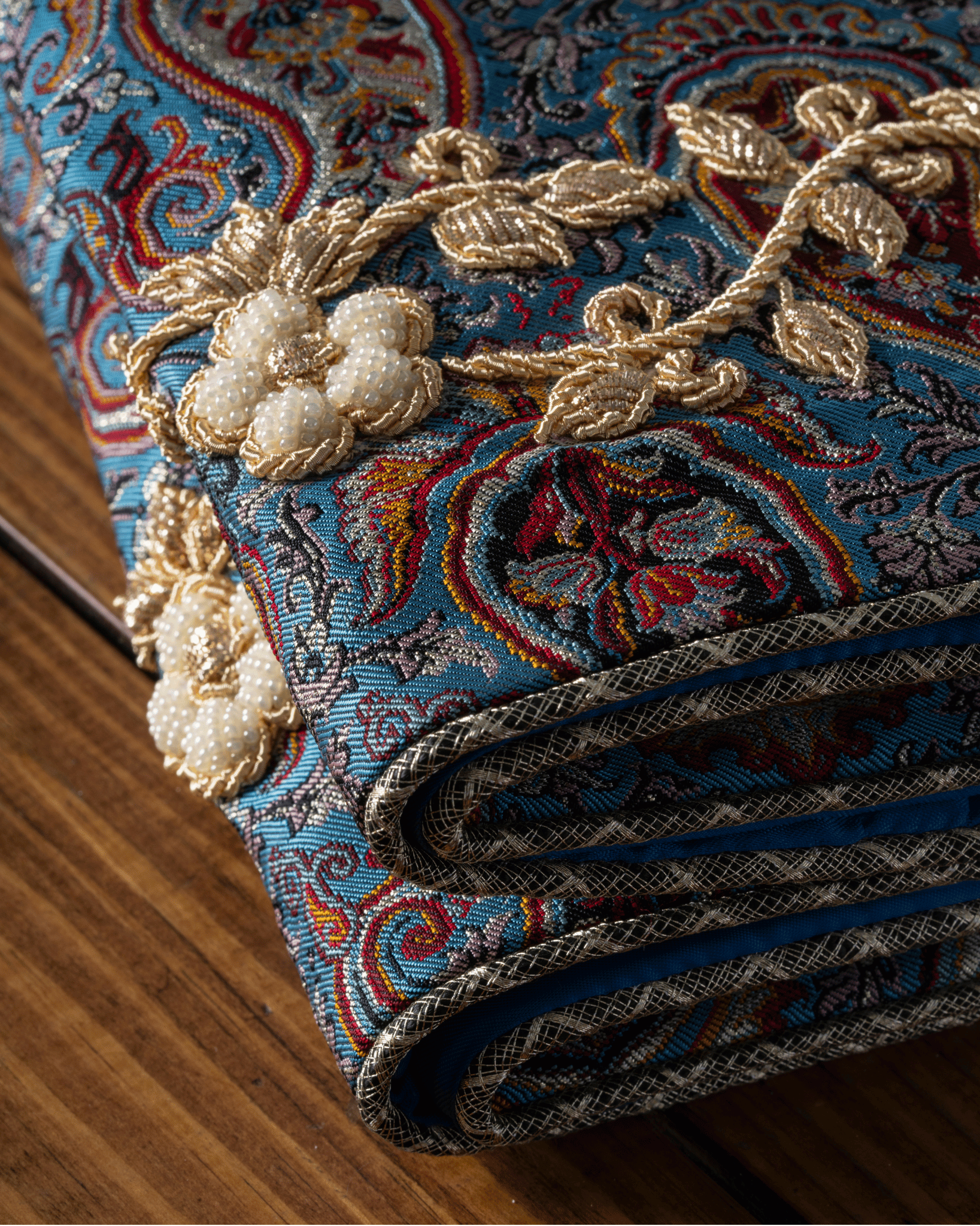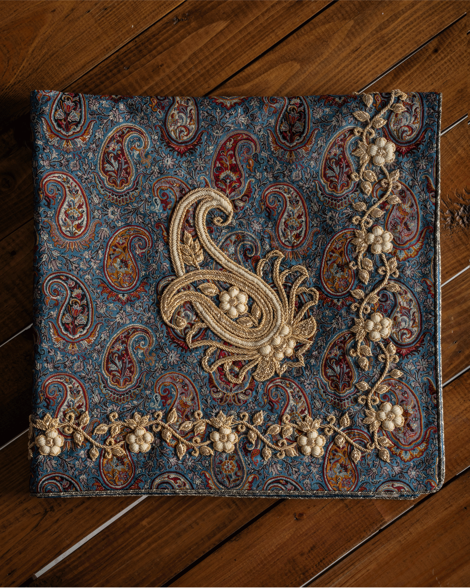 The fabric featured in this artwork is Termeh, a luxurious silk textile renowned for its elegance and vibrancy, crafted in the historic city of Yazd. Each piece is transformed into a masterpiece by skilled artisans, who breathe life into its intricate patterns with hand-embroidered metallic threads (sermeh) and shimmering beads. These designs, initially envisioned by designers through traditional printing, are elevated through hours of delicate craftsmanship. The result is a timeless expression of authentic Iranian art, offered as a heartfelt gift to grace and enrich your home.