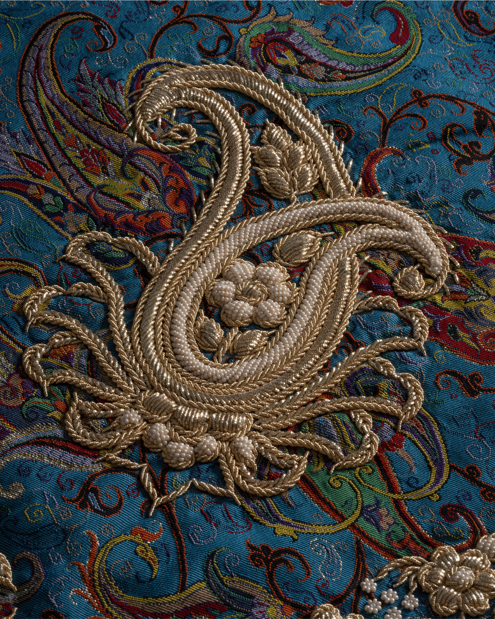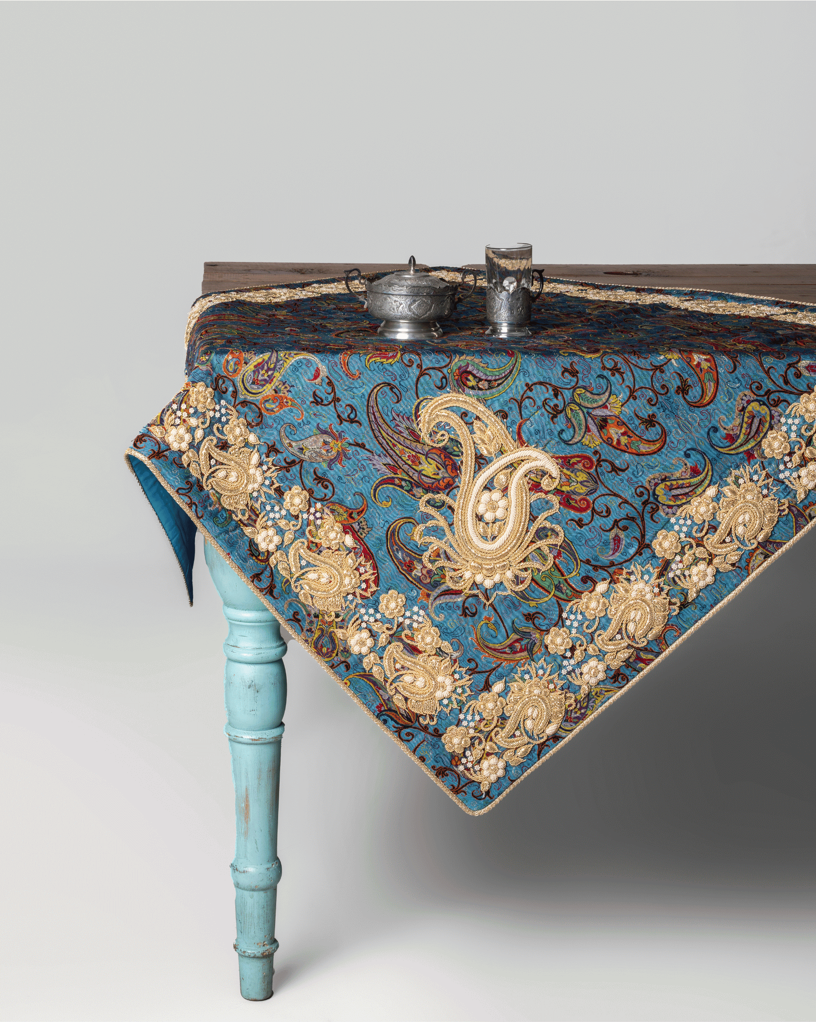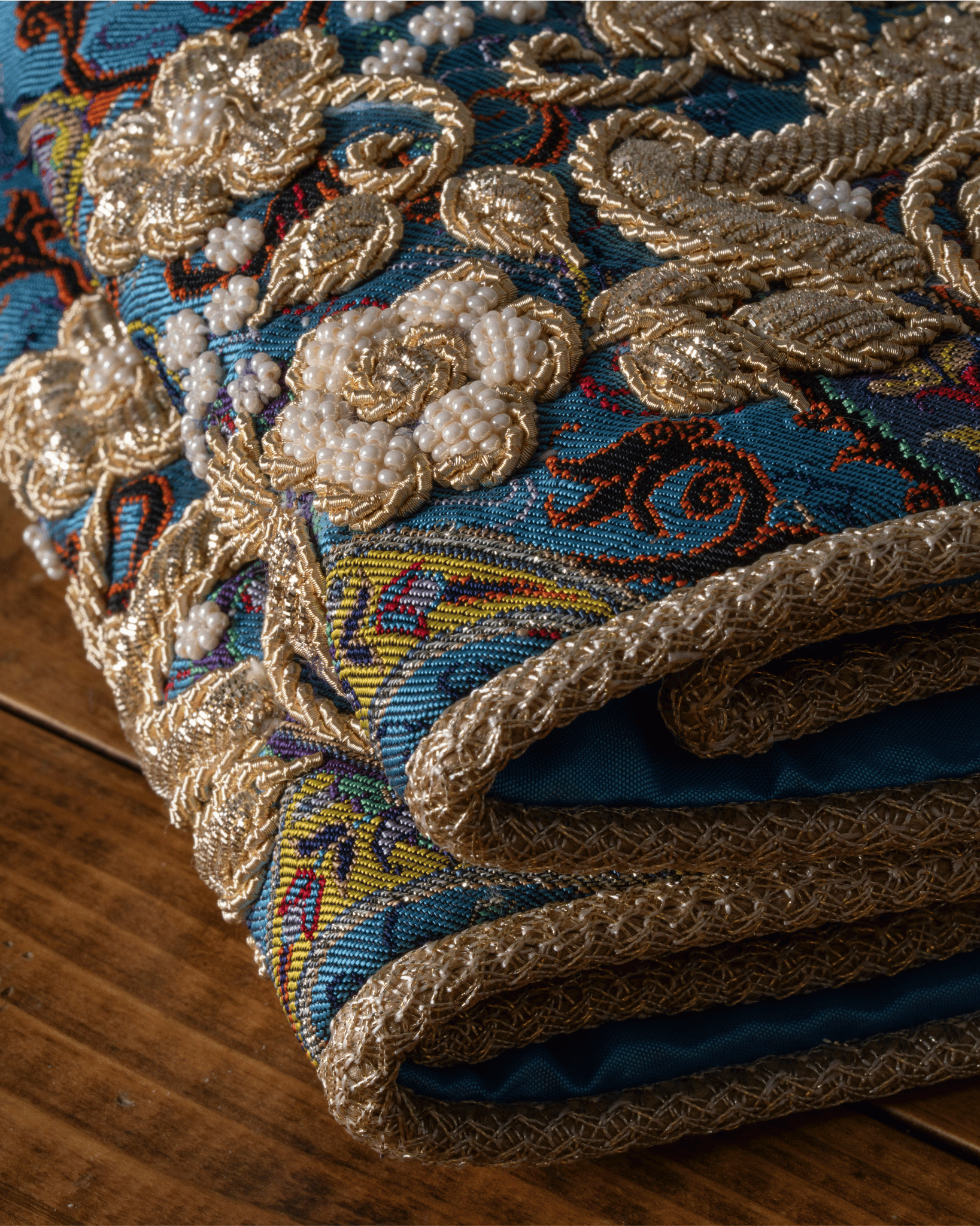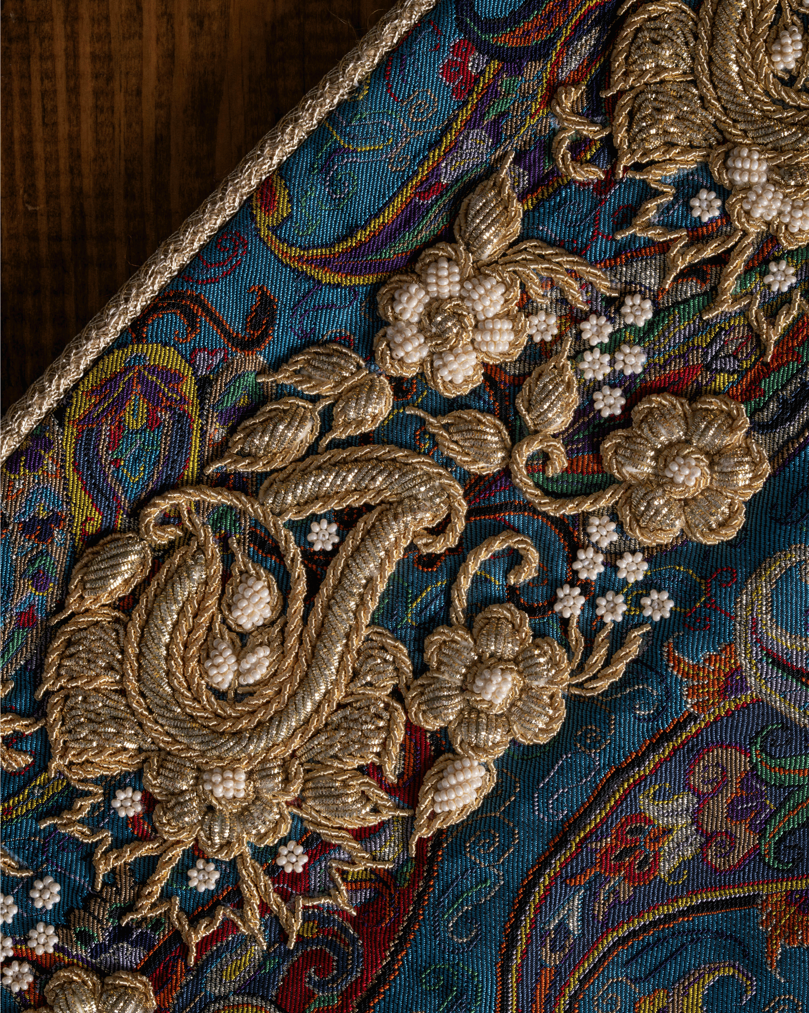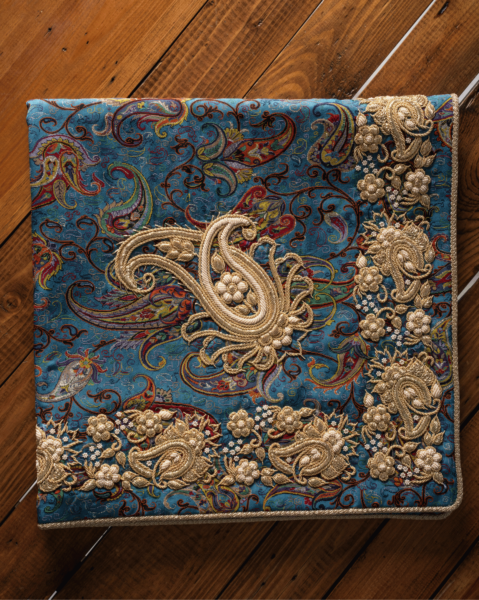 The fabric featured in this artwork is Termeh, a luxurious silk textile renowned for its elegance and vibrancy, crafted in the historic city of Yazd. Each piece is transformed into a masterpiece by skilled artisans, who breathe life into its intricate patterns with hand-embroidered metallic threads (sermeh) and shimmering beads. These designs, initially envisioned by designers through traditional printing, are elevated through hours of delicate craftsmanship. The result is a timeless expression of authentic Iranian art, offered as a heartfelt gift to grace and enrich your home.