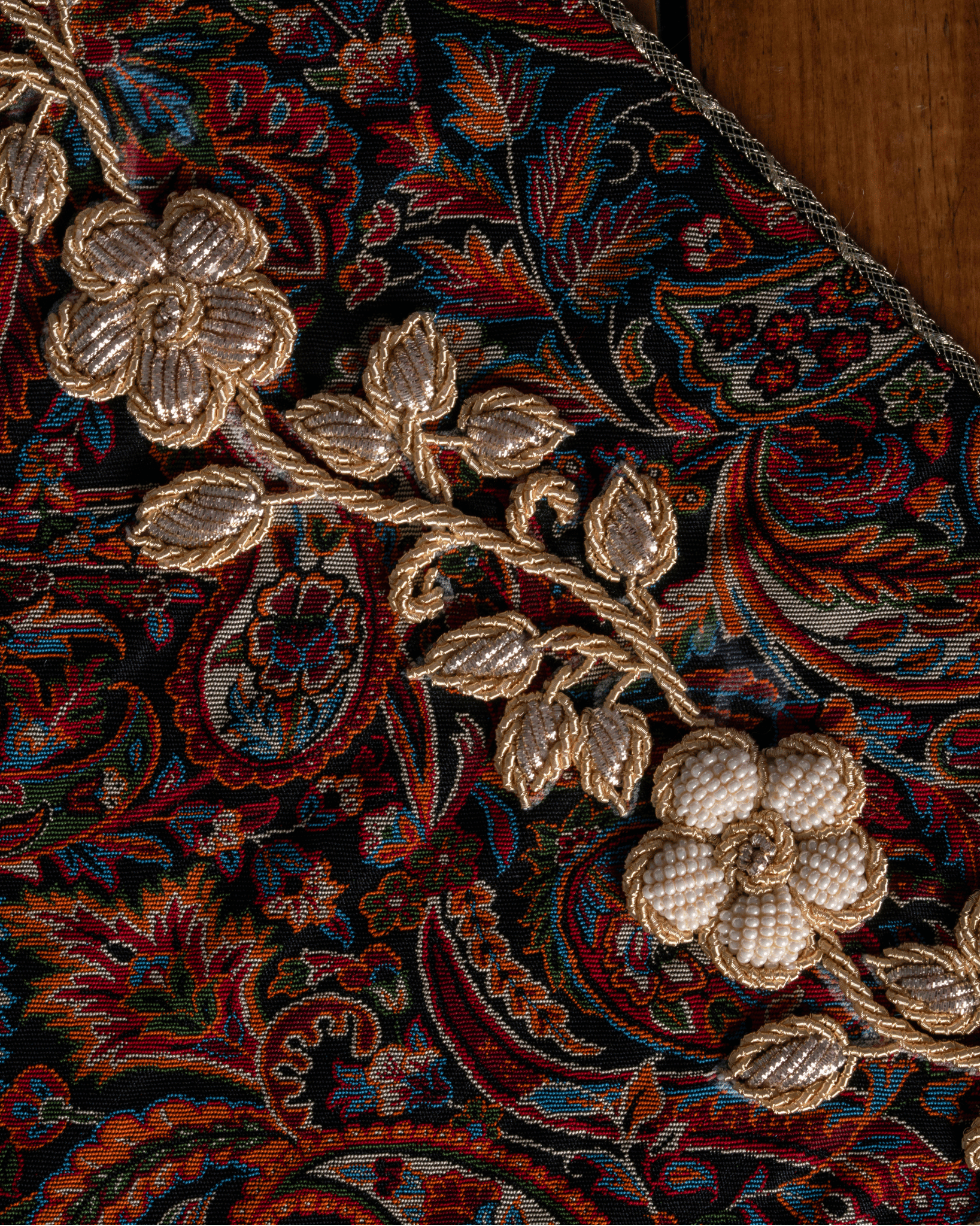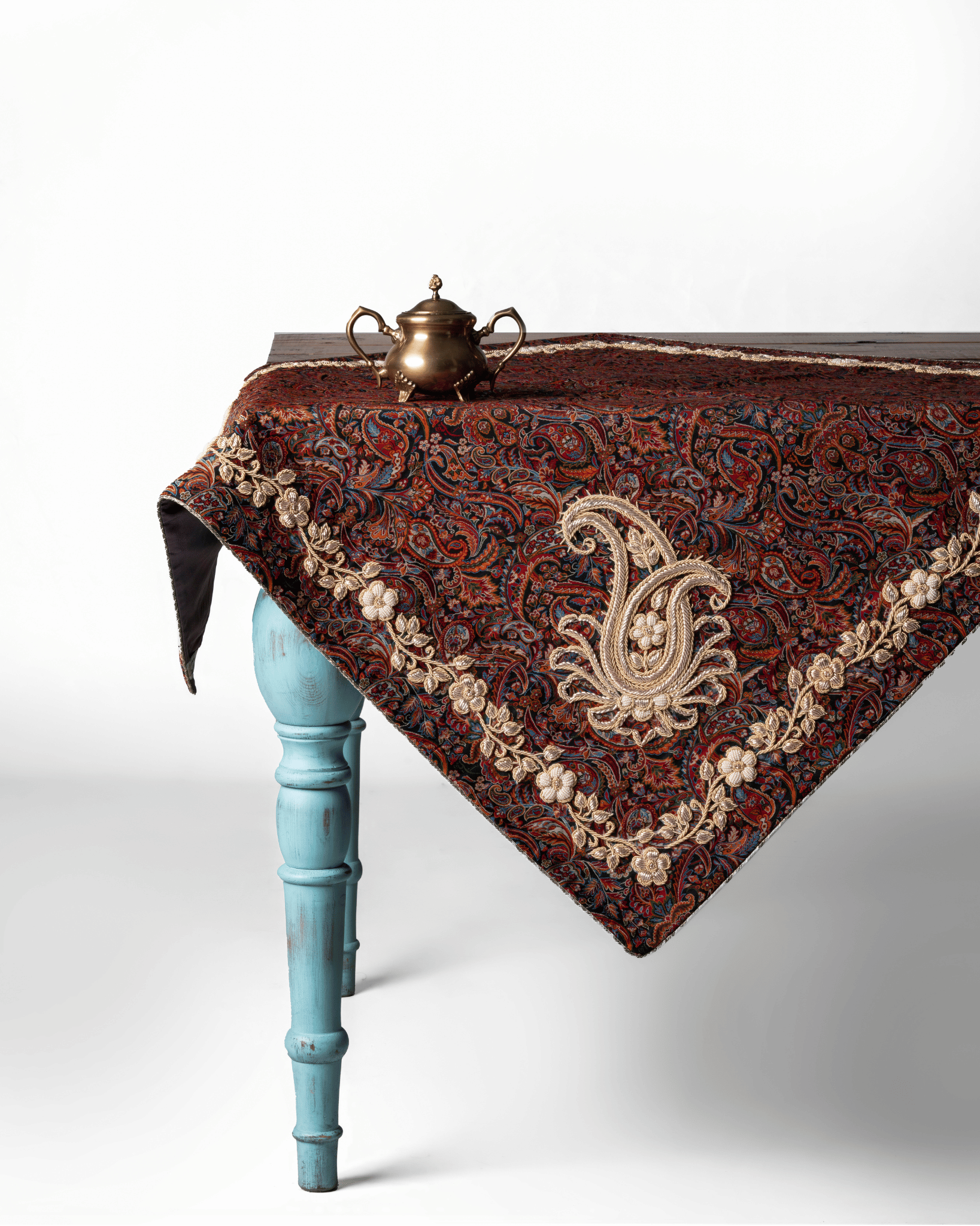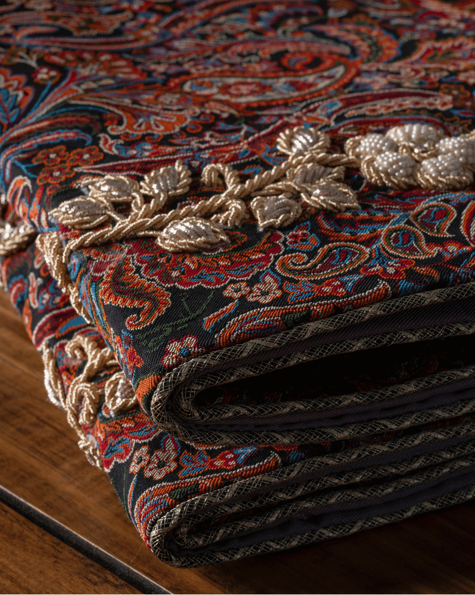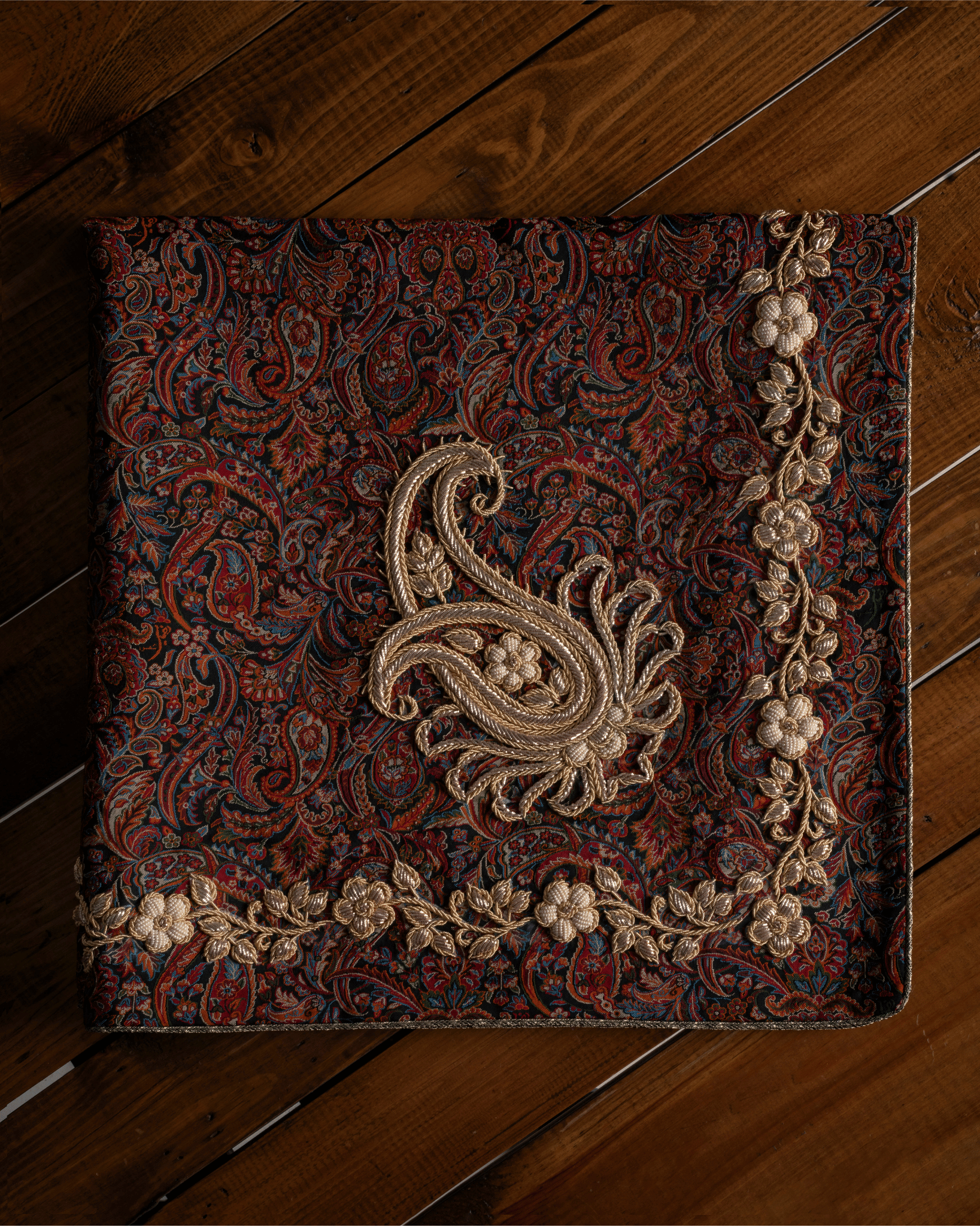The fabric featured in this artwork is Termeh, a luxurious silk textile renowned for its elegance and vibrancy, crafted in the historic city of Yazd. Each piece is transformed into a masterpiece by skilled artisans, who breathe life into its intricate patterns with hand-embroidered metallic threads (sermeh) and shimmering beads. These designs, initially envisioned by designers through traditional printing, are elevated through hours of delicate craftsmanship. The result is a timeless expression of authentic Iranian art, offered as a heartfelt gift to grace and enrich your home.